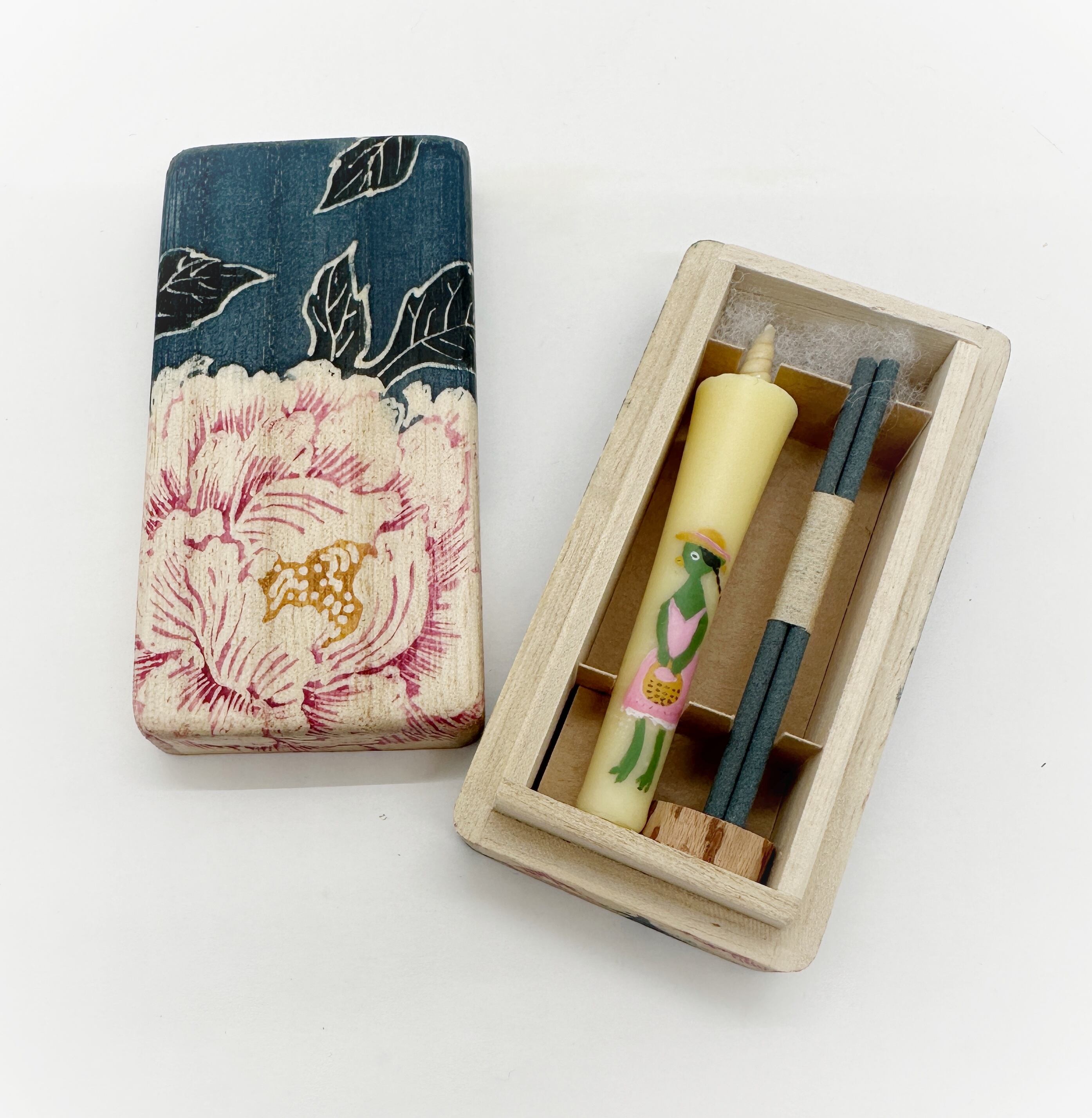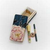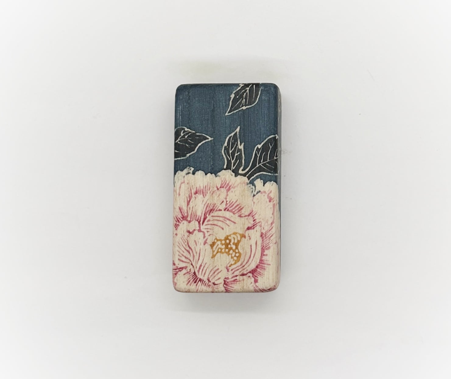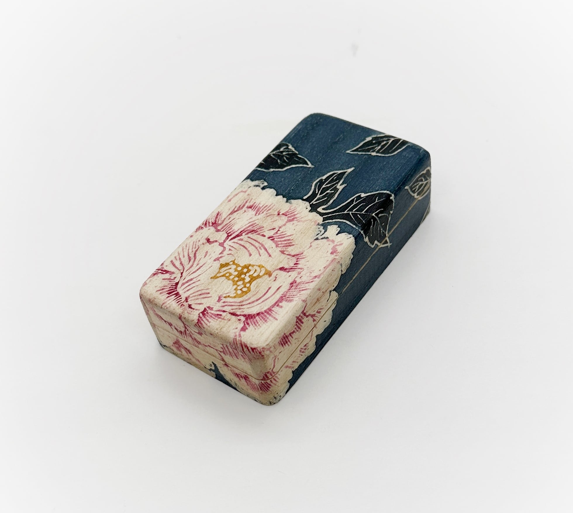 桐箱はロウケツ染めで白牡丹の文様を描いています。